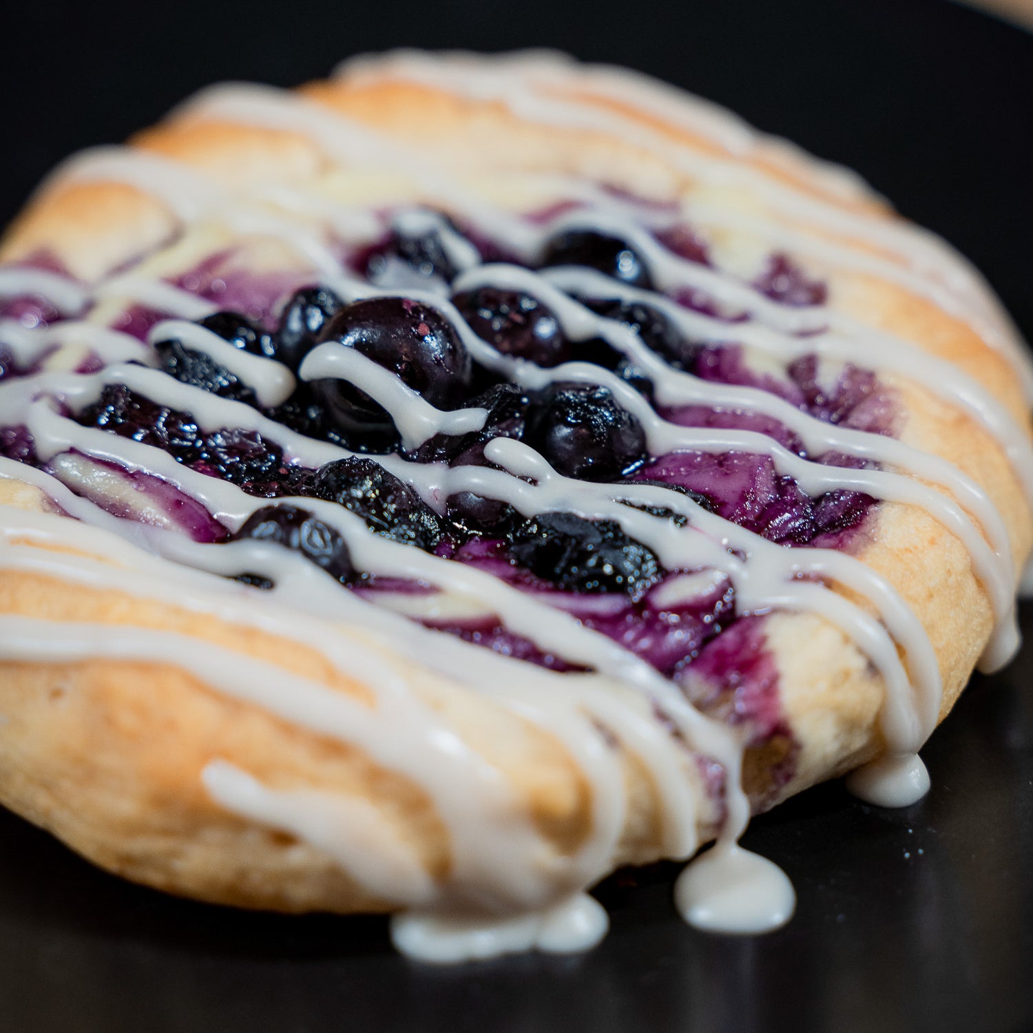 A brioche pastry filled with cream cheese and topped with blueberry compote and a vanilla glaze. Comes in a box of 4 danishes.