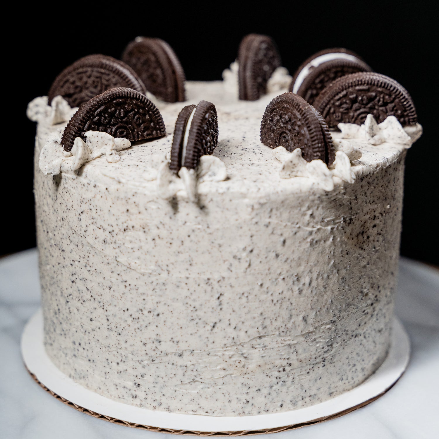The Cookies and Cream Chocolate Cake comes as a 6", 8", or 10” layered cake. All cakes are decorated with buttercream icing.
